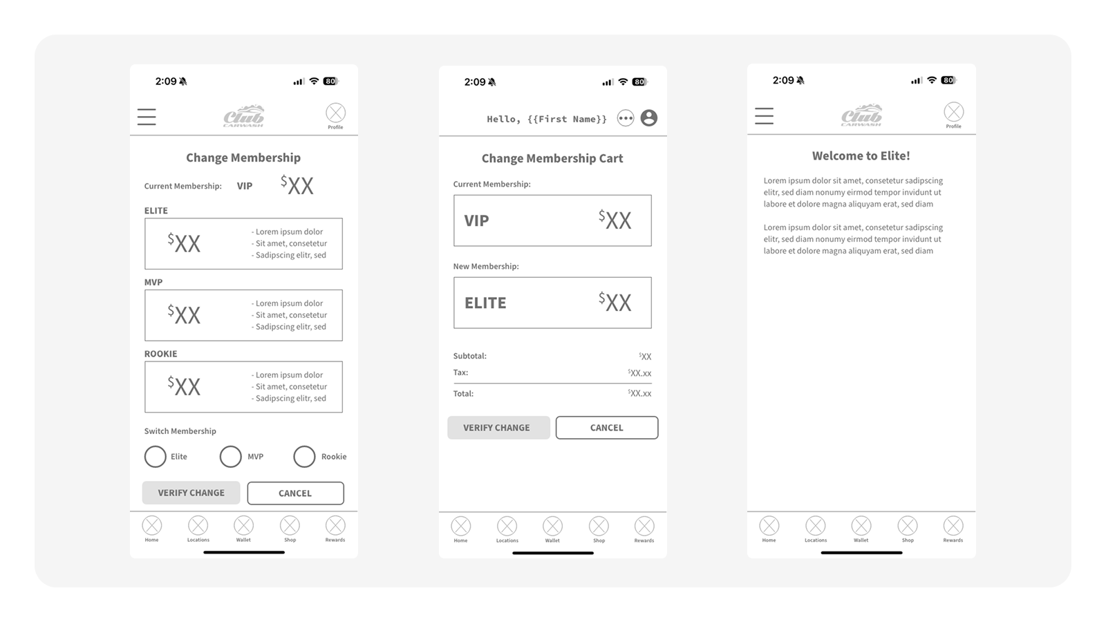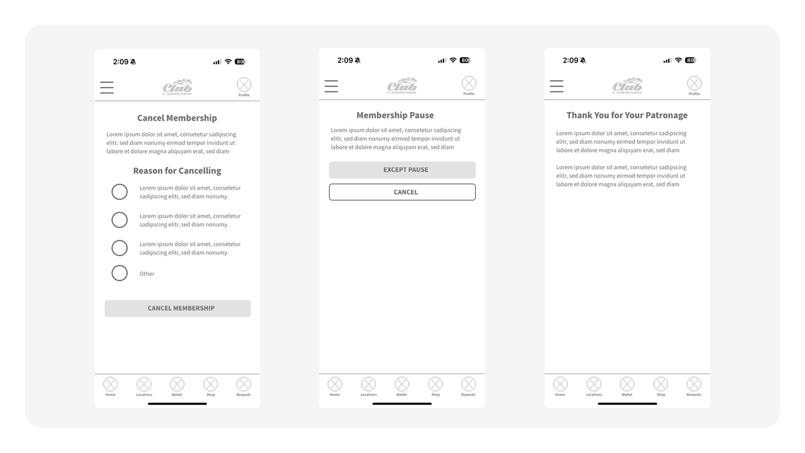 I'm showcasing the wireframes for the Manage Membership user Flow, highlighting the 0 > 1 process. This is one of many user flows that were tackled to create this mobile app.